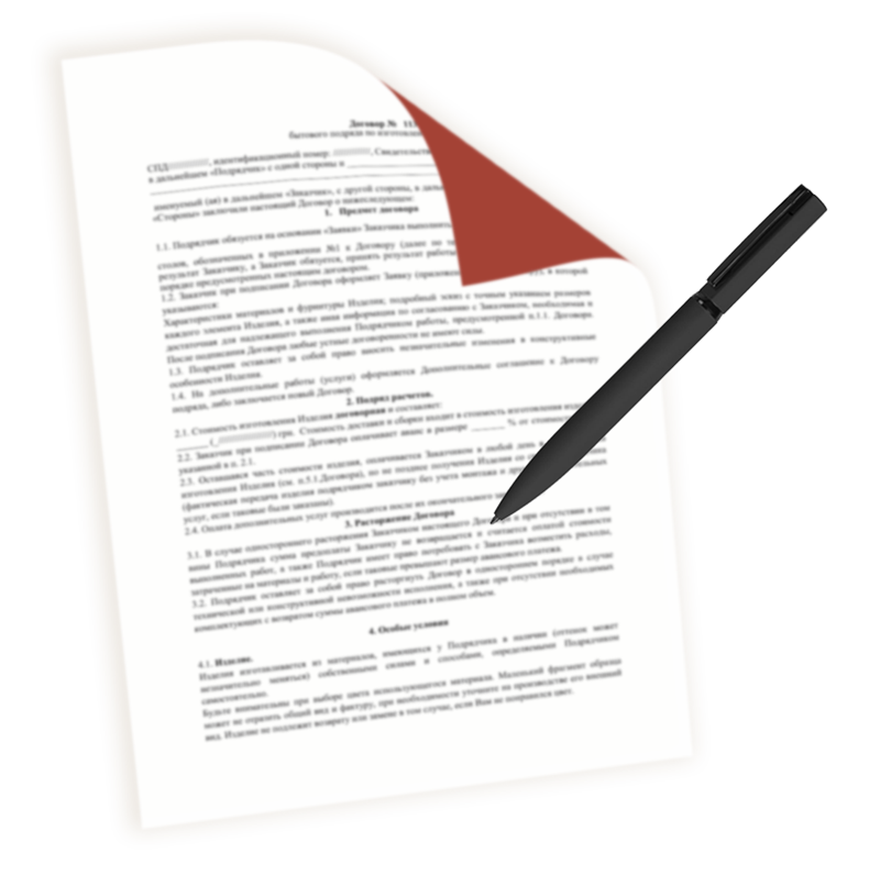 Заключаем договор, с полной спецификацией мебели. В нем четко обозначены стоимость и сроки изготовления, поставки мебели